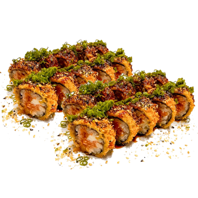 Camarão empanado e cream cheese. Por fora laminas de salmão maçaricadas, crispy de couve, tarê e gergelim